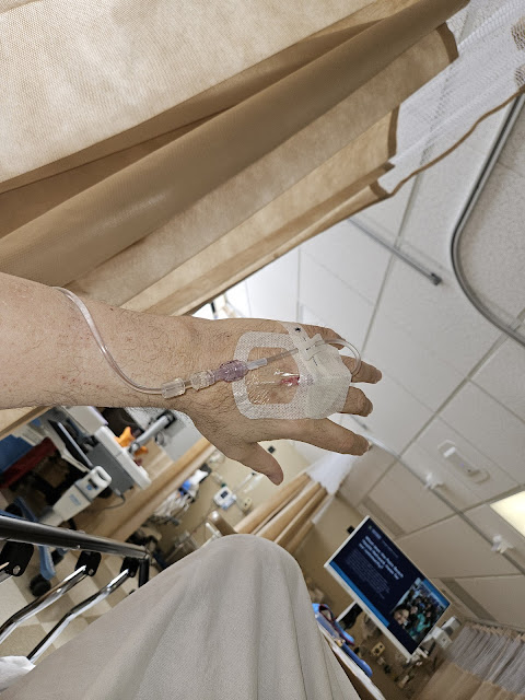This morning, I received an intravenous needle and port in the back of my left hand before being wheeled on a bed into the imaging room for the procedure. (See photo.) When I was transferred from the bed to the narrow, hard operating table, I immediately experienced severe pain. My back hurt so much as a result of my two spinal surgeries late last year.